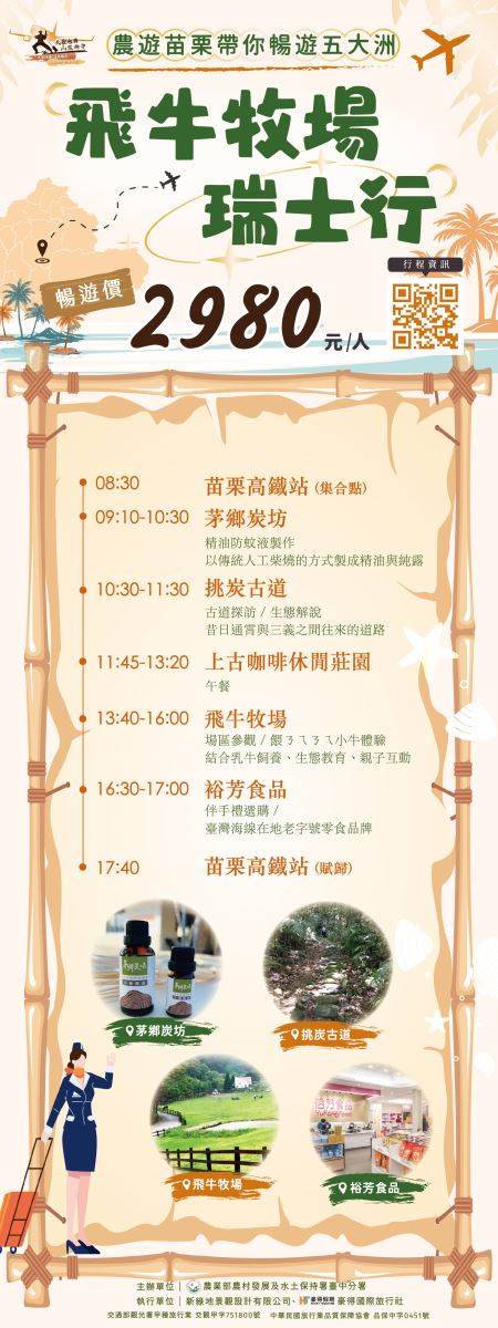 4.此行程為配合苗栗縣政府專案執行,採6人包團方式採購,不開放散客報名。有意者請電洽農創家旅行社。TEL : 04-23393028