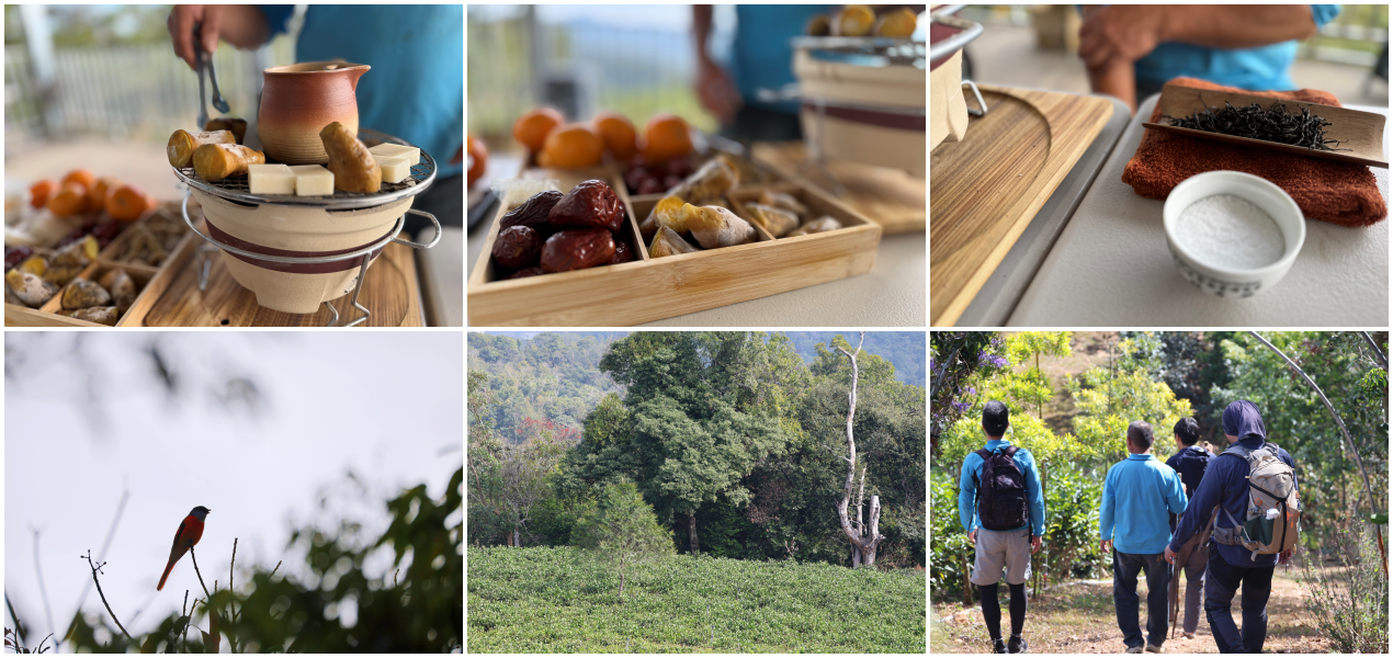 行程介紹 : 埔里參贊堂集合(生態導覽員佈達安全注意事項,發放冷泡白魚紅茶每人一瓶) > 森林步道健行(台灣變葉木的特色與沿途動植物的生態解說) > 白魚紅茶園的生態導覽(聽聽茶園主人如何將這片土地變成野生動物的天堂) > 圍爐煮茶(用炭火煮白魚紅茶與炭烤茶食,感受冬季的山林風光。) > 午餐時光(蔬食野菜火鍋,可改葷食。) > 森林步道下行 > 返回上車處(結束行程)