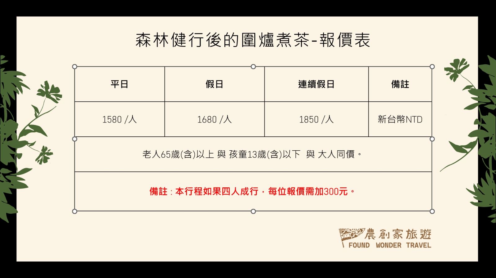 PS : 如果非開團日期,如人數達六位以上,可依照客戶時間需求包團出發。